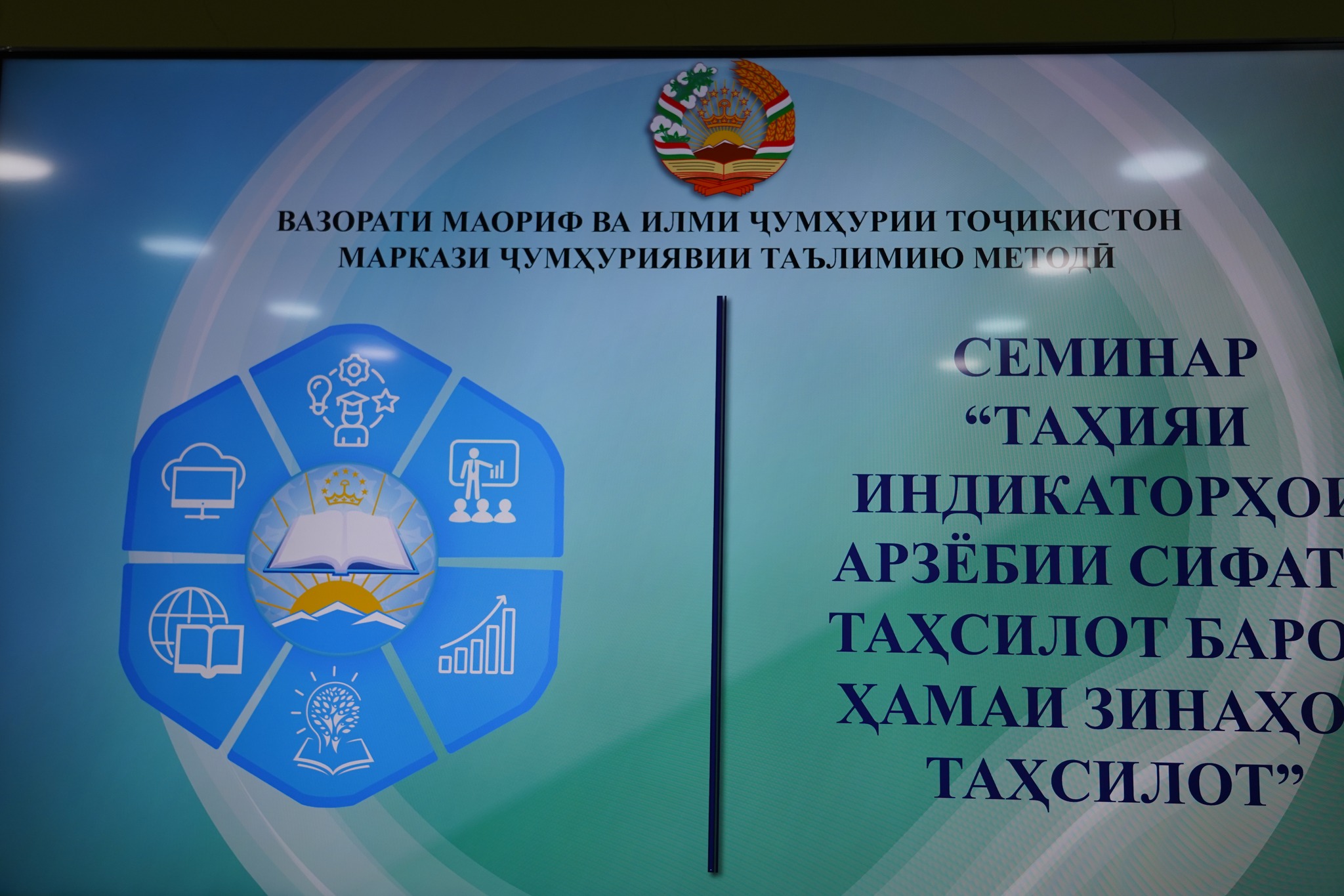 26 июни соли 2025 дар Маркази ҷумҳуриявии таълимию методии назди Вазорати маориф ва илми Ҷумҳурии Тоҷикистон семинар-машварати омӯзишӣ оид ба «Таҳияи индикаторҳои арзёбии сифати таҳсилот барои ҳамаи зинаҳои таҳсилот» бо иштироки намояндагони Вазорати маориф ва илм, Маркази ҷумҳуриявии таълимию методӣ, Академияи таҳсилоти Тоҷикистон ва Пажӯҳишгоҳи рушди маориф ба номи Абдураҳмони Ҷомӣ баргузор гардид.
